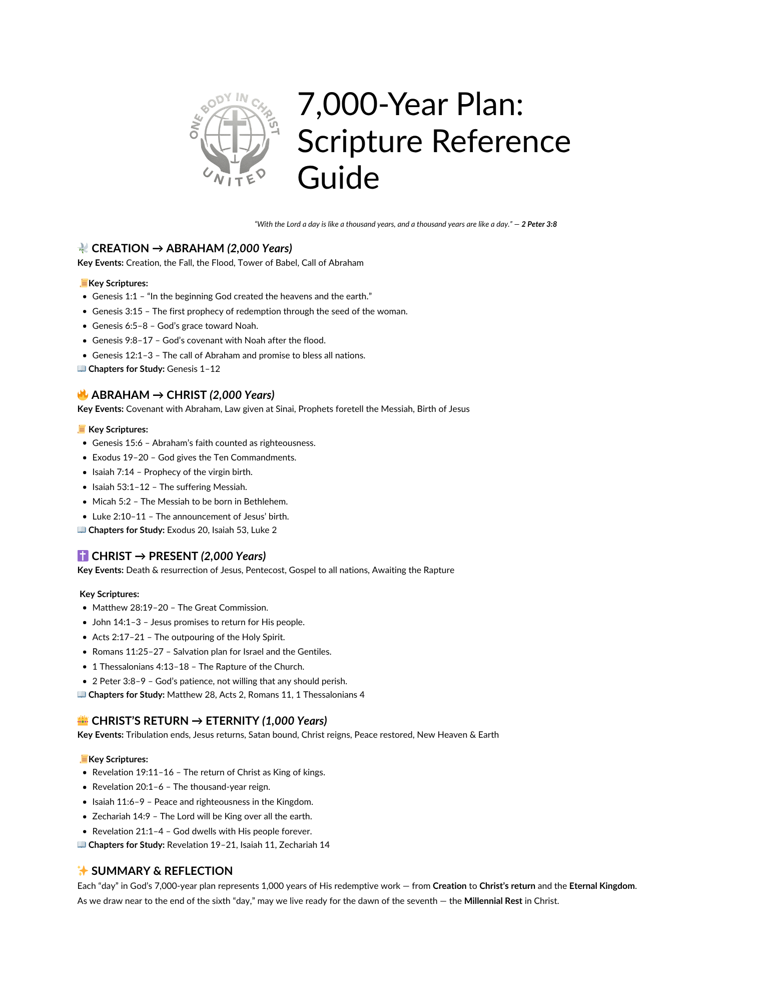 Explore the verses that form the foundation of the 7,000-year timeline — from Genesis to Revelation. This printable guide organizes every Scripture mentioned in the teaching so you can study, highlight, and cross-reference at your own pace.